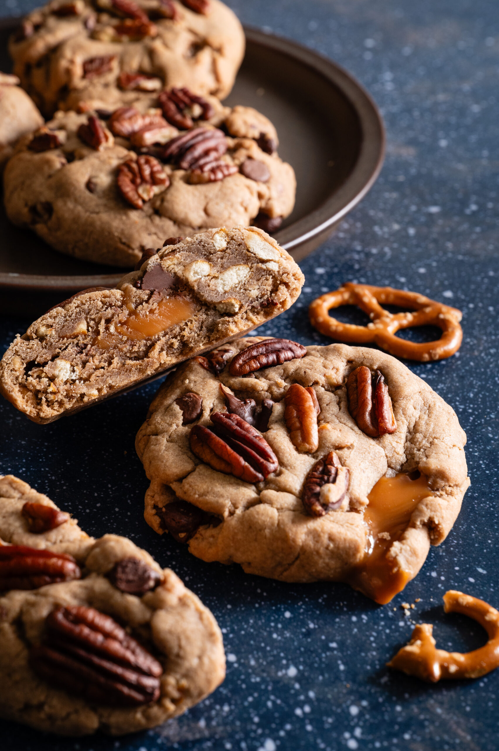 Meet Grandma’s irresistible Turtle Cookies – a delicious twist on a classic favorite treat! Each cookie is packed with rich chocolate chips, crunchy pretzels and whole pecans for that signature turtle crunch. At the heart of every bite, you’ll discover a gooey caramel center that melts perfectly into the warm dough. Get them fresh out of the oven!