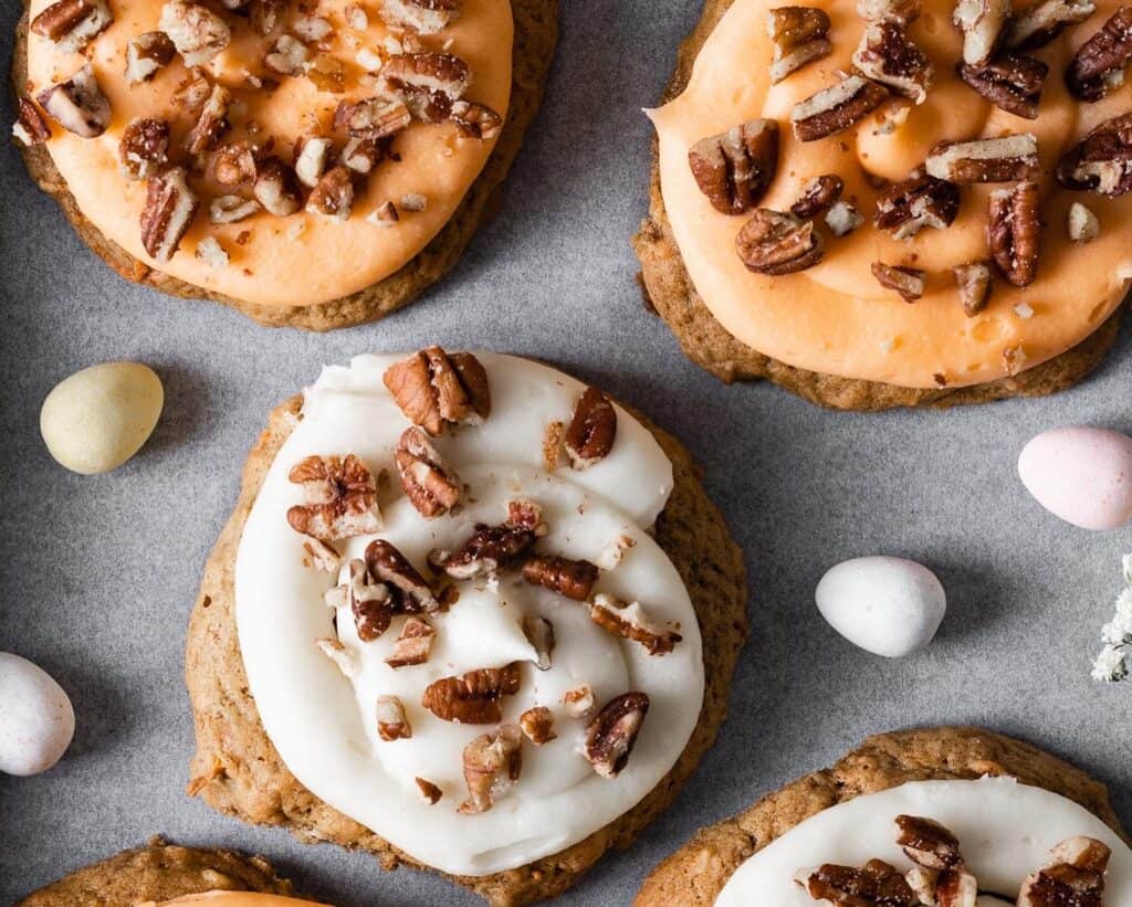 These cake cookies are packed with fresh grated carrots, vanilla and cinnamon. Each cookie is iced with our homemade cream cheese frosting. The perfect spring treat!